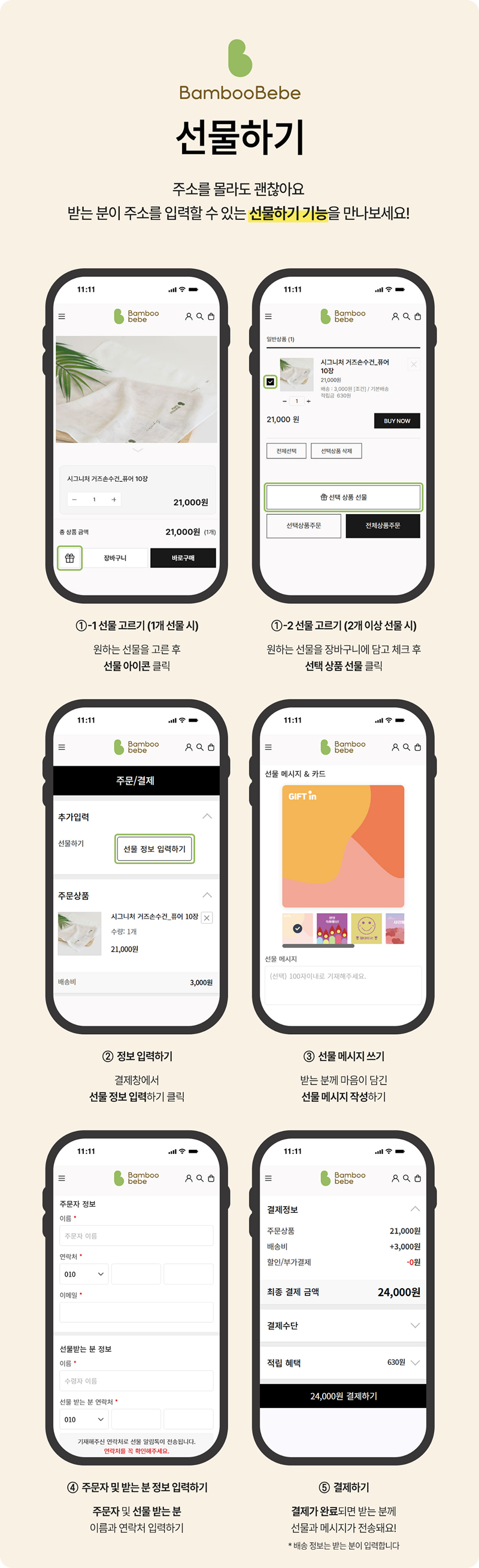- 메시지 카드 톤 맞춤 : “축하해요/고마워요” 같은 기본 문구보다, 밤부베베의 감도에 맞는 따뜻한 문장을 준비하면 기억에 남습니다.